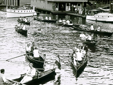 Roeiers in de Nieuwe Haven bij het botenhuis van de roei- en zeilvereniging.