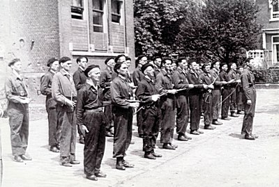 - Leden van de Binnenlandse Strijdkrachten voor de HBS in het Oranjepark.