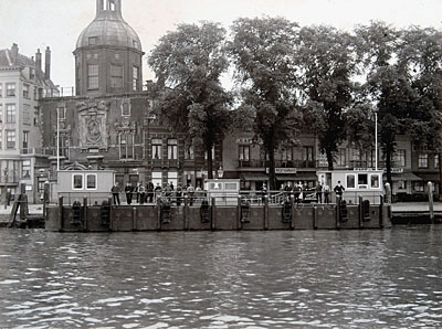 - Een nieuwe ponton als aanlegplaats voor schepen van rederij Fop Smit aan het Groothoofd. Op de ponton zijn wachtkamers voor passagiers van de eerste en de tweede klasse, tevens een bureau voor plaatskaartjes. Geheel links Hotel Bellevue, daarnaast de Groothoofdspoort.