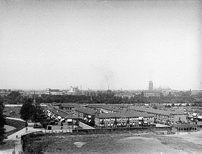 - Op de voorgrond de Jacob Catsstraat, die links uitkomt op de Brouwersdijk. De linker zijstraat is de Vossiusstraat, rechts de Camphuijzenstraat. Op de achtergrond v.l.n.r. de fabrieken EMF en Victoria, de koepel van villa Rozenhof, gebouw van de verkeringsmaatschappij Eerste Nederlandsche, daarachter de Grote Kerk.