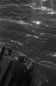 Visser bij woelig water.