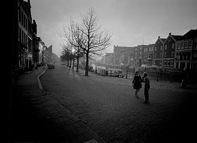 - De Wolwevershaven vanaf het Vlak richting Damiatebrug. Het hoge dak is van pakhuis Stokholm, Rechts de Kuipershaven.