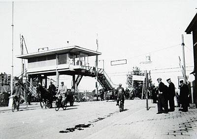 - De spoorwegovergang naar Krispijn, gezien in de richting van de stad. Achter het seinwachtershuisje de voetgangers loopbrug over het spoor