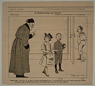 Spotprent op de wisseling op het Ministerie van Financiën op 9 februari 1916 vader Cort …