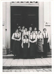 - Groepsportret van een kring van 9 meisjes en hun leidster (met hoed, onderwijzeres mej. Lundgren) van de RK-meisjesclub De Graal op de stoep van de Sint Anna huishoudschool aan de Voorstraat. De meisjes zijn gekleed in gele blouse, groene rok en paarse stropdas. Zij spraken, baden, speelden en deden mee in optochten. Rechts staat Rika Hurkmans, 17 jaar oud.