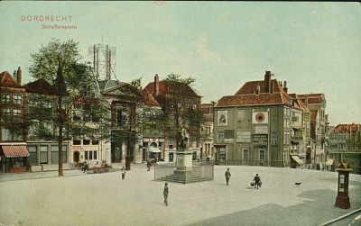 - Antennes van de Nederlandsche Bell Telephoon Maatschappij op het dak van de Waag. Op het Scheffersplein staat het standbeeld van Ary Scheffer.