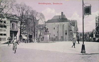 - Het standbeeld van Ary Scheffer op het Scheffersplein. Links in het midden het Waaggebouw.