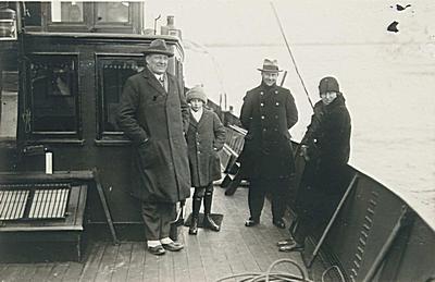 - Ir. Kraijenhoff (directeur Rijkswaterstaat, links) op het dek van directievaartuig en ijsbreker Christiaan Brunings en de familie Schönfeld