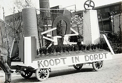 - 5e lustrum Dordtse Winkeliers Vereniging (Lichtweek). Wagenreclame (ontwerp Dirk Meesters) in de A. de Gelderstraat achter de fabriek van Lips.