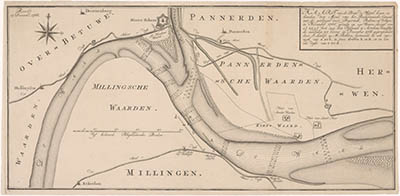 - Kaart van de Waal bij de mond van het Pannerdens Kanaal, met dieptemetingen en voorgestelde werken (door J. Lulofs en M. Bolstra) om meer water in het Pannerdens Kanaal te voeren.