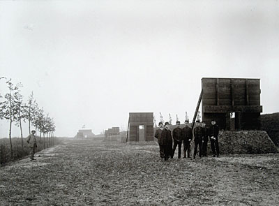 Schietbaan tussen Wantijpark en Noordendijk. Met baard is burgemeester Wichers. Achter hem Van Ruyven, directeur Gemeentewerken. Geheel links een opzichter van Gemeentewerken.