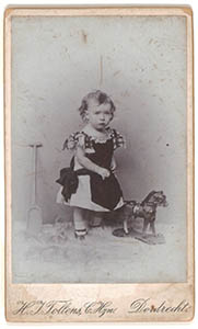 - Portret van Sophie van der Straaten als ca. 3-jarig meisje, staand op een vachtje met speelgoedpaardje en een schep. Zij zou omstreeks 1879 te Dordrecht zijn geboren en omstreeks 1928 aldaar zijn overleden en geliëerd zijn aan de familie Morks. De enige Sophie van der Straaten die in de Dordtse geboorteregisters tussen 1873 en 1882 voorkomt is Sophia Adriana Cornelia, geboren op 30 september 1874. Tollens (de fotograaf) was 3 jaar na 1874 of 1879 nog niet werkzaam als fotograaf, hij kan wel later een reproductie hebben gemaakt.
