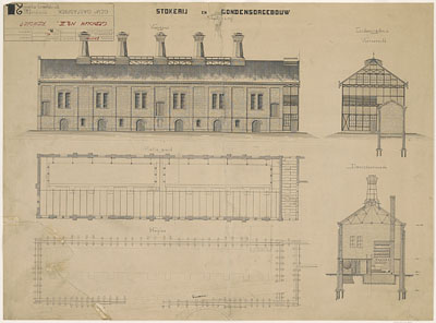 - De bouwtekening van een stokerij en condensorgebouw voor de Gasfabriek aan de Merwekade.