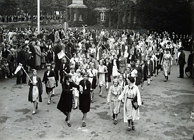 - Vakantiekinderfeest op het Stationsplein. Op de achtergrond villa Simpang.