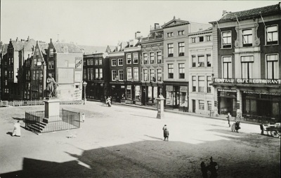 - Het Scheffersplein met het standbeeld van Ary Scheffer en een blik richting Voorstraat omstreeks 1905. Foto H.J. Tollens
