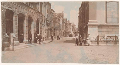 - De Groenmarkt, gezien vanaf het Stadhuisplein; rechts het stadhuis, links het politiebureau met enkele agenten op de stoep, in de verte rijdt een paardetram.