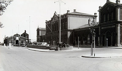 - Station met het Stationsplein. Links staat een loods voor locomotieven.