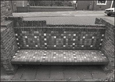 Deze bank is geschonken door Dr.T.A.Hooftman n.a.v. bombardement op 11 mei 1940, de bakstenen zijn afkomstig van het puin van het bombardement
