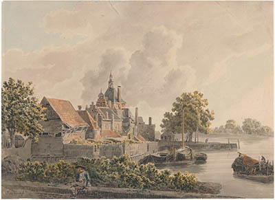 - Gezicht op de Riedijkse poort vanaf het Molenhoofd aan de overzijde van de Riedijkshaven.