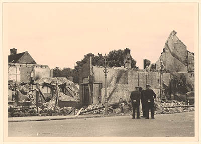 - Tijdens de oorlogsdagen van mei 1940 vernielde huizen op de hoek Hoogt - Sluisweg.