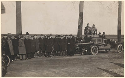 - De Dubbeldamse brandweer met motorspuit A 9502 poseert in gezelschap van belangstellenden (genodigden?) op de Haaswijkweg.