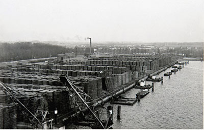 - Uitzicht vanaf een der laadbruggen bij de Zeehaven in de richting van de Straatweg en de stad.