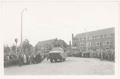 - bevrijding lantaarns / straatverlichting militaire voertuigen militairen / soldaten publiek / toeschouwers