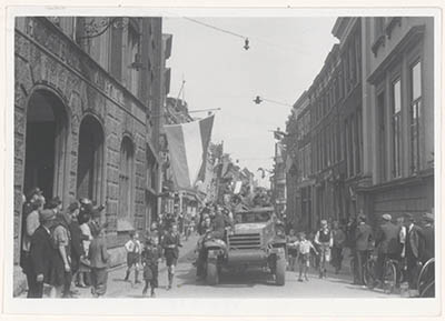 - bevrijding lantaarns / straatverlichting militaire voertuigen publiek / toeschouwers vlaggen(stokken)