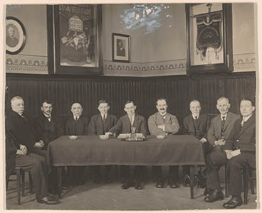 - Het bestuur van de Ned. Chr. Bond van Personeel in Publieken Dienst afdeling Dordrecht in een zaaltje van het Patrimonium in de Lange Breestraat. Aan de wand vaandels van de bond en van de Christelijke Bouwarbeidersbond; de bond droeg de naam Plicht en Recht.