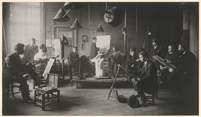 Pictura-leden tekenen naar een levend model. 3e van links Van Randwijk, vervolgens …