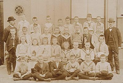 - Klas 5 van een lagere school met de onderwijzers De Koning en Van der Want