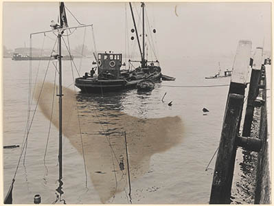 - De mast en het dak steken nog boven water van het op 2 januari 1971 gezonken Duitse motorschip (1130 ton) voor de Merwekade; links de rivier en de Papendrechtse oever.