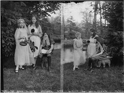 - 2 opnamen van 3 kinderen van de familie De Roo van Westmaas verkleed als kabouter en fee of elf in de tuin van landgoed Weizigt