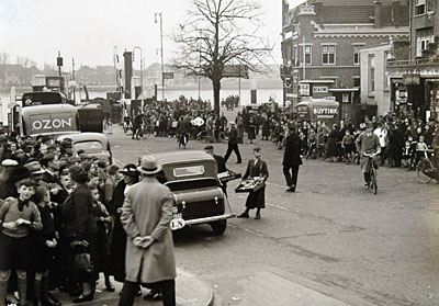 - Veel mensen wachten bij het Zwijndrechts veer op de terugkomst van prinses Juliana en prins Bernhard van hun huwelijksreis. Twee jongens lopen rond om versnaperingen te verkopen.