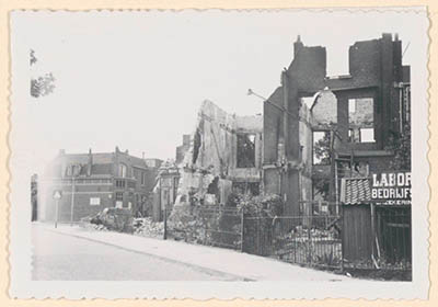 - De door de Duitsers in de Tweede Wereldoorlog stukgeschoten huizen aan de Transvaalstraat op de hoek van de Christiaan de Wetstraat.