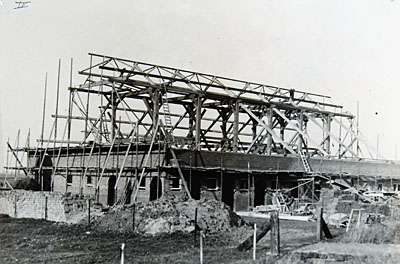 Een schuur in aanbouw in de ingepolderde Biesbosch.