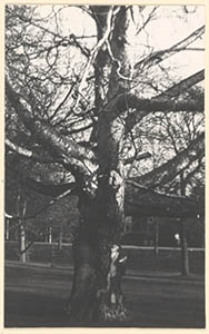 - Een oude boom in Park Merwestein, de Groenedijk op de achtergrond.