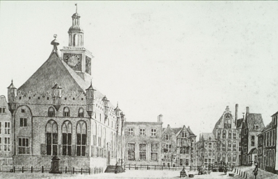 - Achter de Lombardbrug is de Voorstraat en de Lombardstraat zichtbaar. Het Stadhuisplein ligt voor het stadhuis.