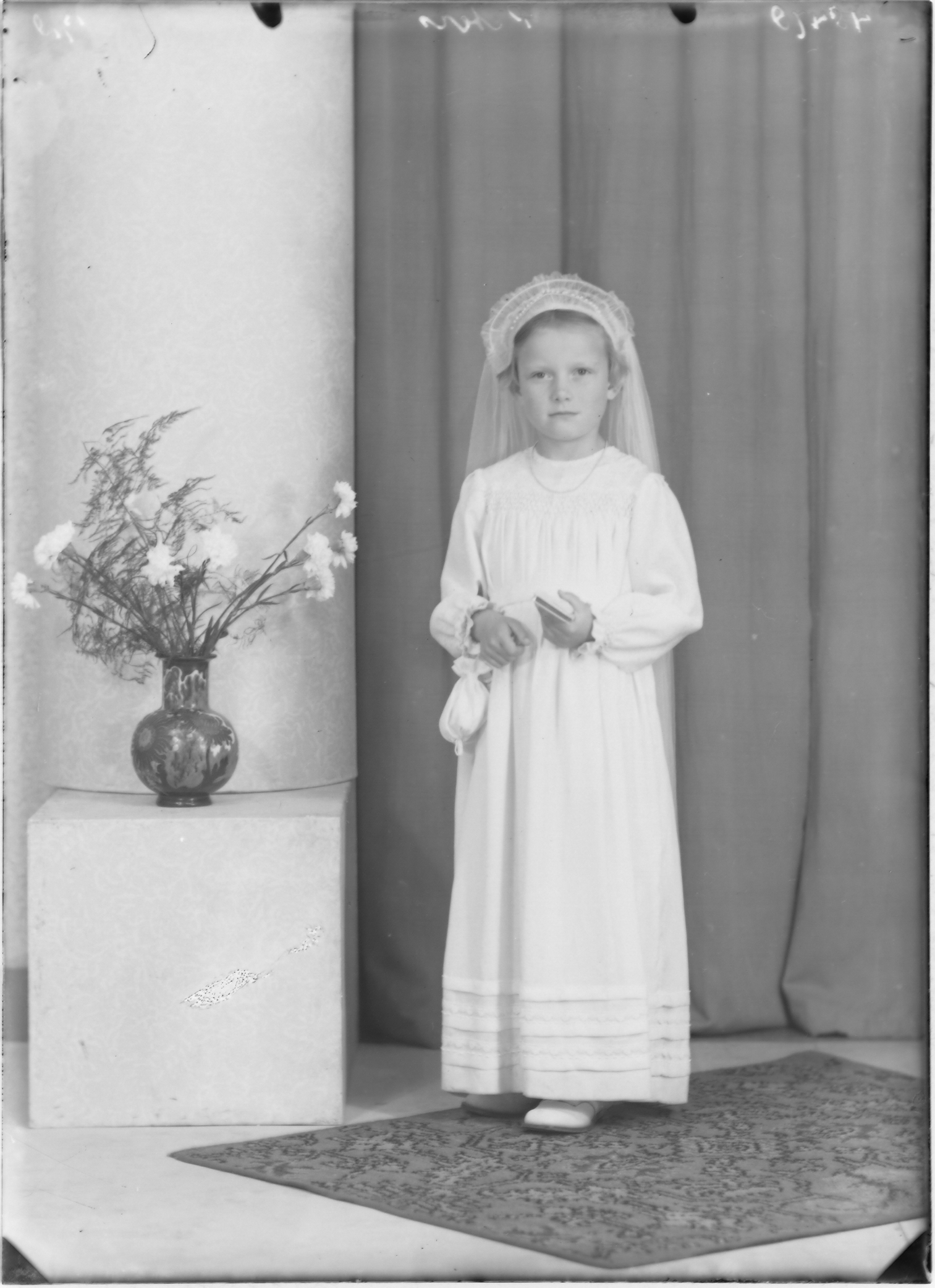meisje, witte jurk, Eerste Heilige communie, communicantje (sluier, handtasje, boekje) ----- BEERMAN 08-10-1947 fotonummer 48478 Peters Reeweg 60 [bron: www.dordtenaZOEKer.nl]