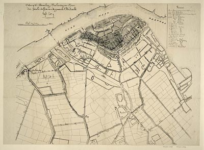 Plattegrond van de stad met hierop aangegeven het ontwerp tot bemaling, riolering en …