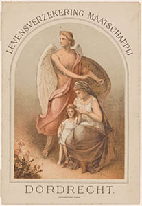 - Reclameplaat van de Levensverzekering Maatschappij Dordrecht met de afbeelding van een weduwe en kind, die door een engel met schild worden beschermd.