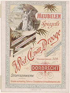 - Reclameplaat van meubelhandel en stoffeerderij Wed. C. van Drooge op de Voorstraat.