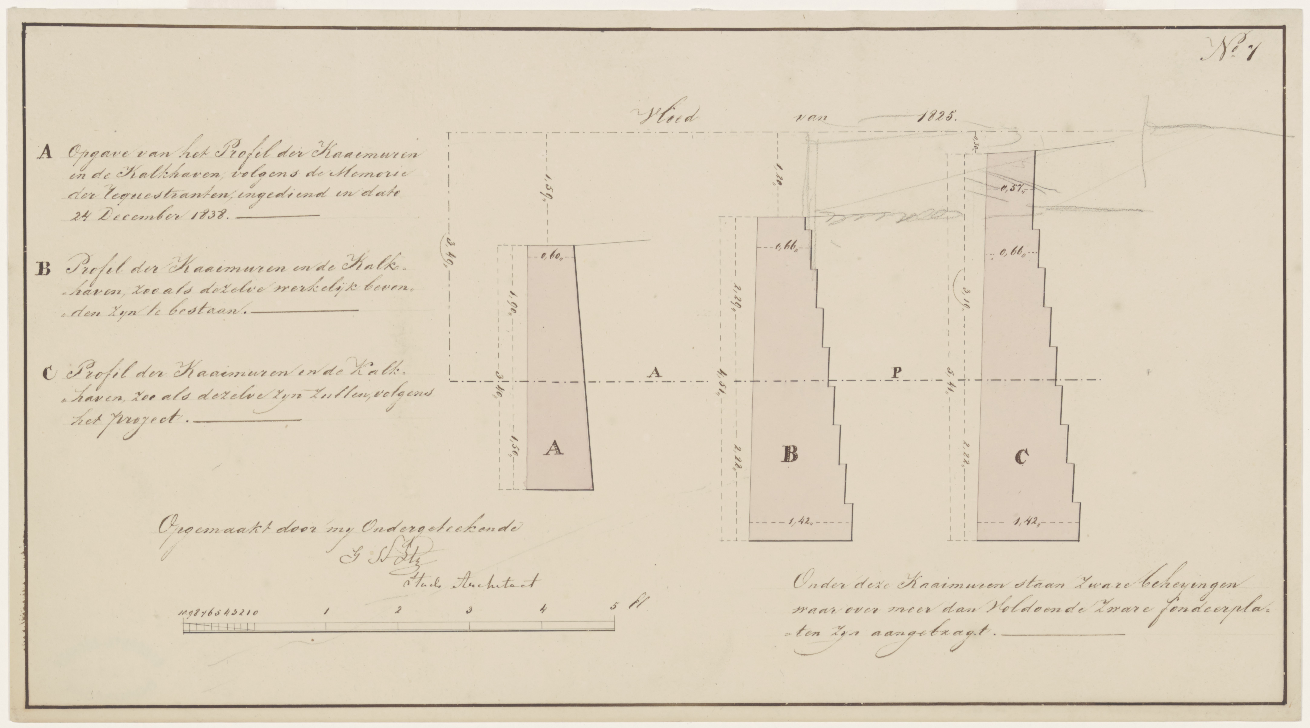 tekening, kademuren Kalkhaven (G.N. Itz) (vloed van 1825)