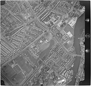 - Luchtfoto van het gebied rondom de kruising Oranjelaan - Noordedijk (midden). Links van boven naar beneden het Gemeenteziekenhuis, de Ziekenverpleging, de Vogelbuurt en de Windhondpolder. Rechts van onder naar boven het Wantijbad, de Eerste Jchthaven, de Prins Hendrikbrug over het Wantij en de elektriciteitscentrale en molen Kijck over den Dijck op de Noordendijk.