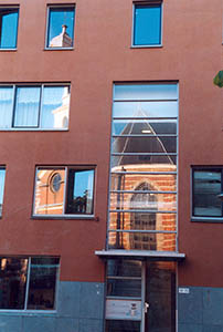 - Weerspiegeling van de Nieuwkerk in de beglazing van woningen aan de westzijde van het Nieuwkerksplein.