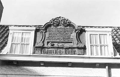 - Bovenstuk van de oorspronkelijke poort met de wapens van de stichters op de daklijst van het middelste huisje van de Koningshof aan de zijde van de Mariënbornstraat.