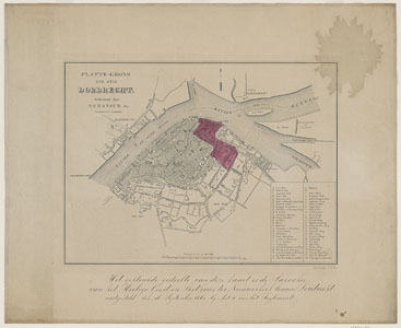 - De kaart van de binnenstad van Dordrecht met in kleur erop aangegeven de parochie van het Heilige Geest- en Pesthuis ter Nieuwkerk, zoals vastgesteld op 16 september 1863.