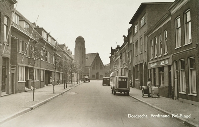 - De Ferdinand Bolsingel in de richting van de Christelijk Gereformeerde Kerk op de hoek van de Dubbeldamseweg Noord. Midden rechts de bestelauto van wasserij Meeldijk.