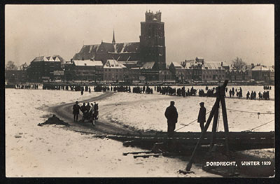 Dichtgevroren Oude Maas t.h.v. de Hooikade, de Grote Kerk …