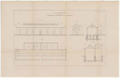 Aanzicht, plattegrond en doorsnede van een bergplaats …